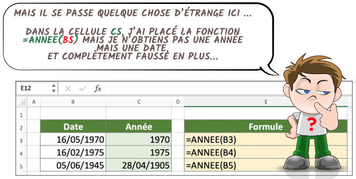 Explication : en C3 et C4, les cellules sont au format Nombre et affichent la bonne année. Mais en C5, le résultat attendu devrait être 1945.