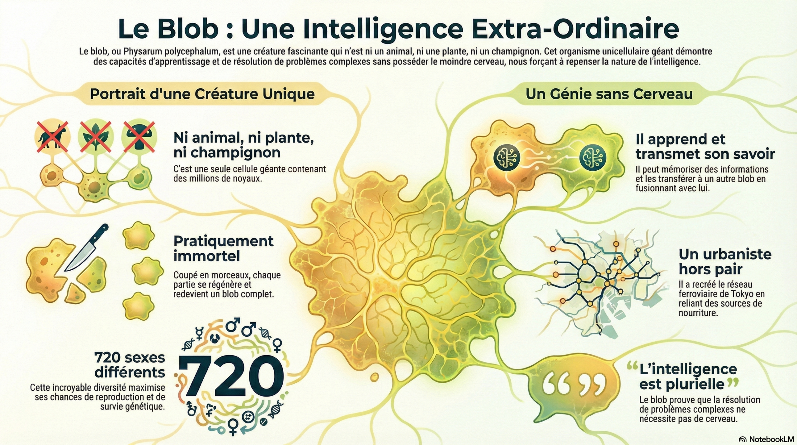 - Le Muséum national d’Histoire naturelle propose un article grand public sur « le blob, l’organisme sans tête qui révolutionne l’étude de l’intelligence », utile comme support de compréhension scientifique pour les apprenants.